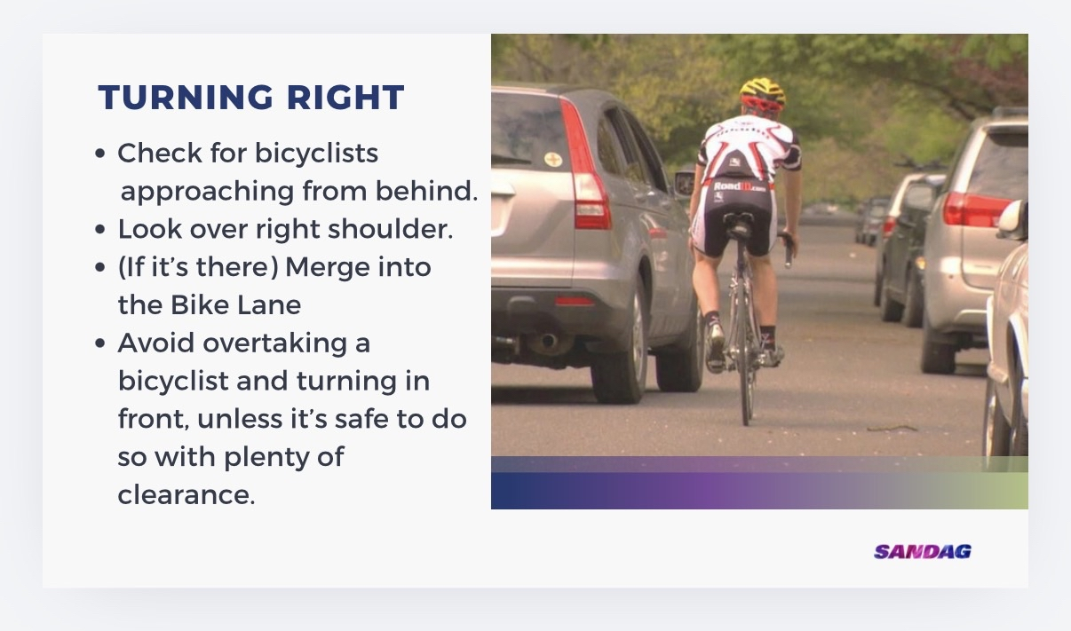 Our organization frequently teaches classes for riders to understand how to safely ride a bike, and for drivers to understand the rules of the road when interacting with a bicycle. I'm sending a screenshot from that class which displays the same idea.